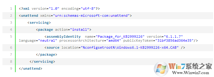 卡住的原因是找不到包的路径,在xml文件中有一个节点,它的路径标识成 ,%configsetroot%是一个用户环境变量,但是在默认不存在,所以wusa.exe会找不到Windows6.1-KB2999226-x64.CAB