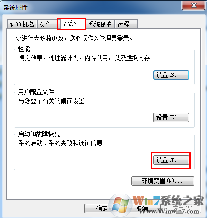 2、在系统属性页面选择高级选项进入启动和故障恢复设置;