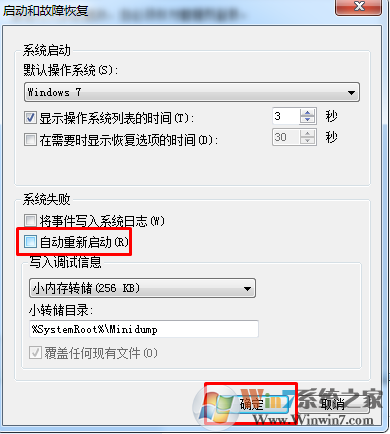 3、在启动和故障恢复设置中取消勾选自动重新启动即可。