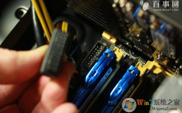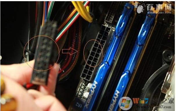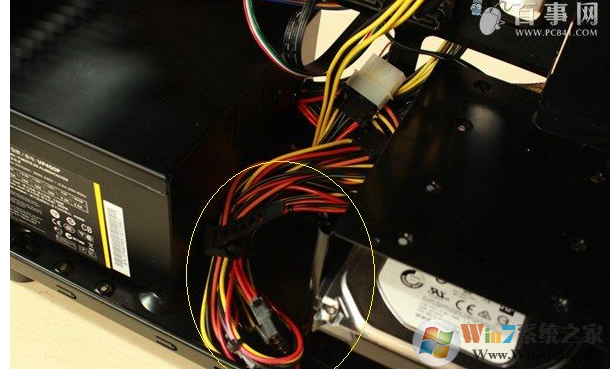 因为机箱带有 USB3.0 接口,所以需要单独的 USB3.0 供电线,下图这根线也是电源上带的,长这个样子记住。这个电源插头是插在内存条左边的黑色插槽中的,如下图所示。