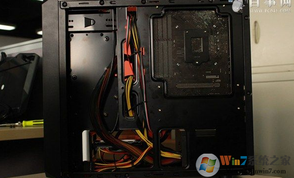 装好后的机箱内部前面效果,一般已经看不到主板前面大堆的线材了,对于个人或者家用用户来说,这样内部已经够整洁了,没必要过于追求完美走背线。