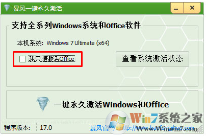2、将我只想激活office勾选。由于暴风激活工具属于新的激活工具,还没有完全经过各大杀毒软件的检测,为了广大用户的激活成功率,最好先关闭电脑上的杀毒软件!