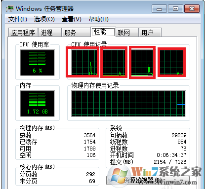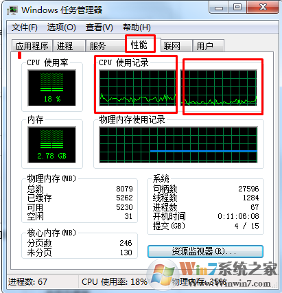 切换到性能选项,我们就可以看见自己的cpu是几个波段了,如果是2个框那么就说明是双核的,我们只需要理解几个框就是几核的就可以了