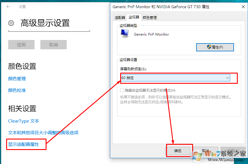 3、显示适配器属性---监视器---屏幕刷新率设置为60HZ--然后确定。