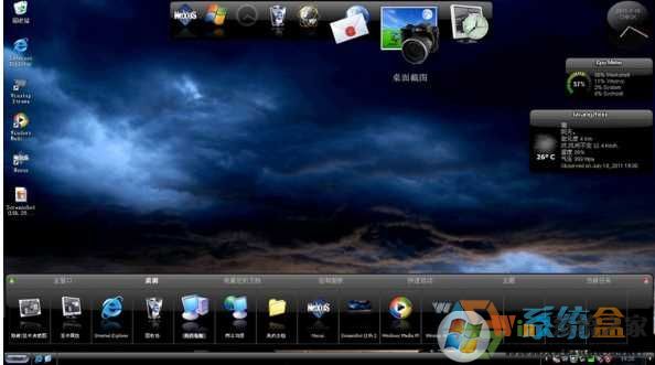 2、上面的图片就是将酷点软件全部开启之后的特效,包括类似MAC的底部任务栏,还有圆形控制面板等等,是十分方便的,你可以自由切入图标,再换一张美丽的墙纸桌面,那更是锦上添花。看看,常用的工具都在里面吧,比开始菜单还要方便呢。