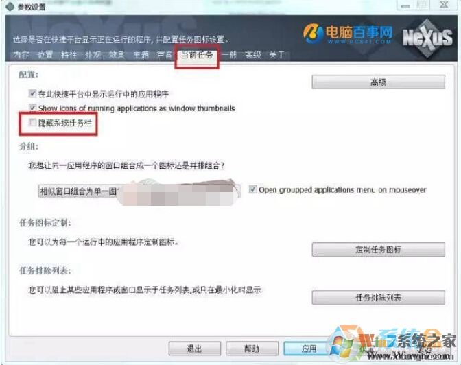 第二步,隐藏桌面任务栏:在winstep的参数设置里,找到当前任务,勾选隐藏系统任务栏即可。我个人习惯把任务栏放在桌面左侧,设置成自动隐藏,其实效果是一样的。