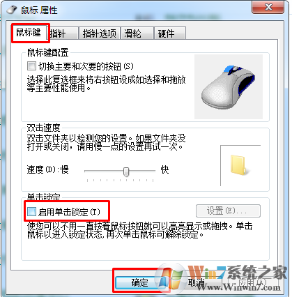 2、如果更换鼠标后还是无效,那么我们就?在控制面板中打开鼠标属性,选定“鼠标键”标签页,其中有三栏,将最下面的“单击锁定”栏中的“启用单击锁定”的勾去掉。?