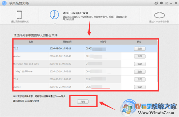 1、打开苹果恢复大师,选择第二种恢复模式,系统会自动扫描保存在本电脑中的所有iTunes备份文件,如果你要查看的备份没有在界面中显示,你可以点击【浏览】进行查找。www.xiuchufang.com Win11系统之家
