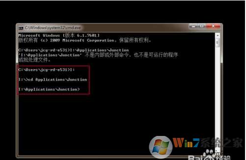 5、打开命令提示符后,输入 解压的盘符 如: I: 回车;然后再输入 CD Applications\Junction 回车,我们就来到I:\Applications\Junction文件夹下了。