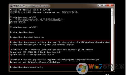 6、在命令行输入命令:junction.exe "C:\Users\用户名\AppData\Roaming\Apple Computer\MobileSync" "G:\Apple\iTunes\MobileSync",按回车。其中第一个参数是您的iTunes备份路径(如前文所述),第二个参数就是要更换的备份路径了。注意“用户名”需要更换成自己计算机的用户名哦。