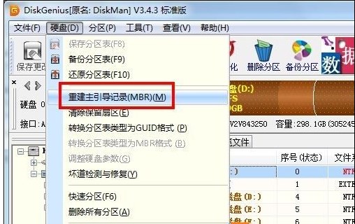 4、点击diskgenius菜单栏 硬盘——重建主引导记录