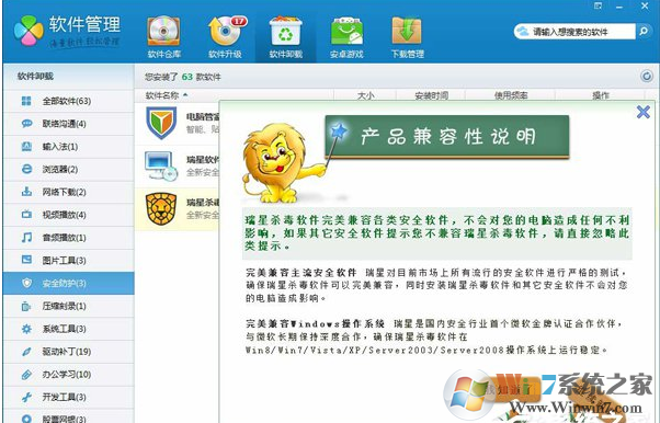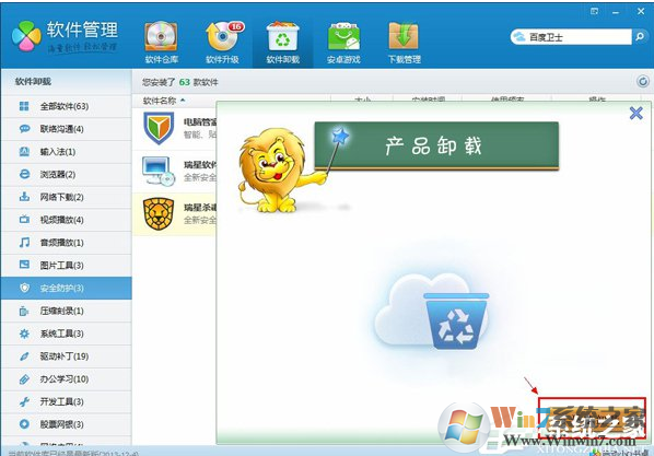 1、打开软件管理——软件卸载——安全防护——瑞星杀毒——卸载。