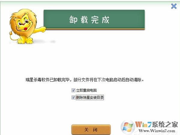 6、卸载完成,勾选“立即重启电脑”和“删除瑞星安装目录”。