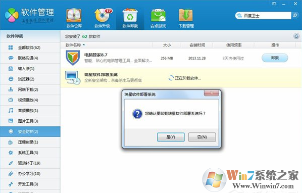 卸载时需要先卸载瑞星杀毒等其他软件,最后卸载瑞星软件部署系统,顺序不能乱。