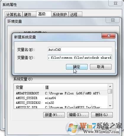 3、点击新建“系统变量”,输入变量名:Auto CAD.变量值为:C:\Program Files\Common Files\Autodesk Shared 点击确定。