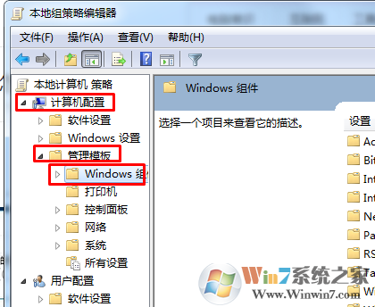 2、打开组策略编辑器后,依次点击“计算机配置-管理模板-Windows组件”