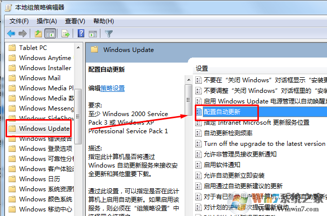 3、接着点击Windows组件下的“Windows update”,在右侧窗口找到“配置自动更新”,双击打开它。