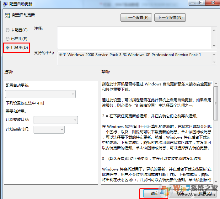 4、在打开的配置自动更新窗口,然后选择“已禁用”,点击确定即可。