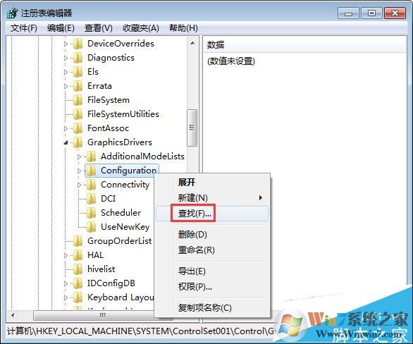 2、找到HKEY_LOCAL_MACHINE/SYSTEM/ControlSet001/Control/GraphicsDrivers/Configuration,右击“Configuration”选择“查找”;