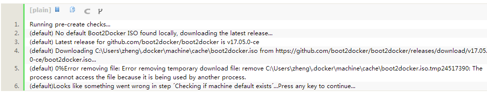 如果存在下载失败的临时文件,要将其删除。(我的机器上的路径是C:\Users\zheng\.docker\machine\cache\boot2docker.iso.tmp24517390)