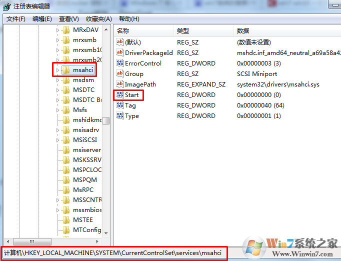 二、然后在注册表编辑器中,依次进入HKEY_LOCAL_MACHINE\System\CurrentControlSet\Services\Msahci键值,然后在右边的窗口中双击START项目,即会弹出一个对话框。