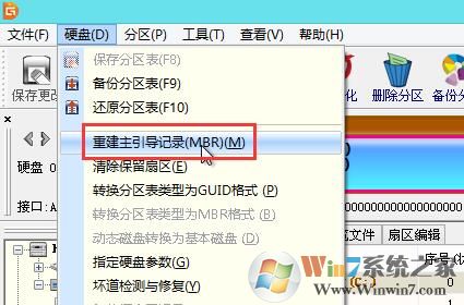 3、在Diskgenius分区工具界面中,点击硬盘选择重建主引导记录,如图所示: