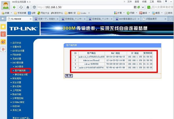 1、选择客户端列表,出现如下图所思界面。客户端列表显示了通过DHCP服务器获得IP地址的主机信息。