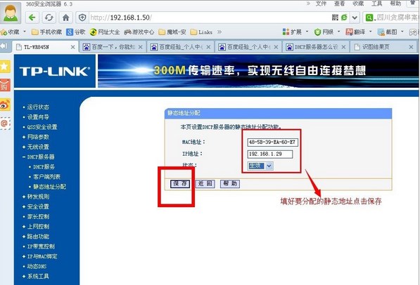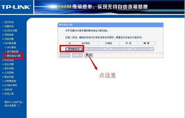 2、单击上图添加条目,在MAC地址中填入要预留静态IP地址的计算机MAC地址,在IP地址中填入为内部局域网主机预留的IP地址,在状态中选择此条目是否生效。配置完成后在静态地址分配界面就会出现一个对应条目。当DHCP服务器为指定的主机分配IP地址时,就将静态分配的IP地址提供给主机,其他主机将无法获得静态分配的IP地址。