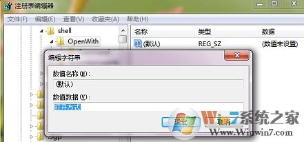 3.之后,咱们对着“Shell”子项再次单击鼠标右键,仍然选择菜单中的“新建”,再新建一个“OpenWith”子项,完成之后,咱们双击右侧窗口中的默认值,在编辑字符串界面,将数据数值设置为“打开方式”,然后点击确定保存即可。