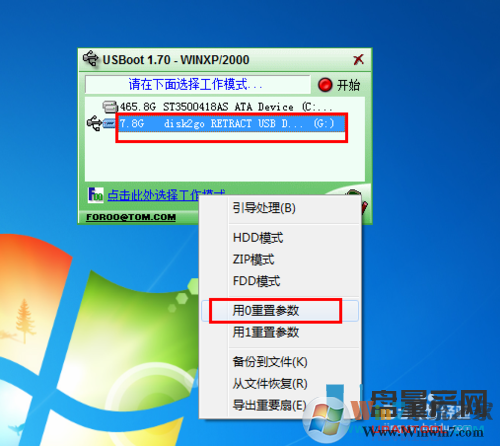 运行USBOOT程序,选择选择要修复的U盘,然后点击“选择工作模式”下拉列表,从中选择“用0重置参数”项。