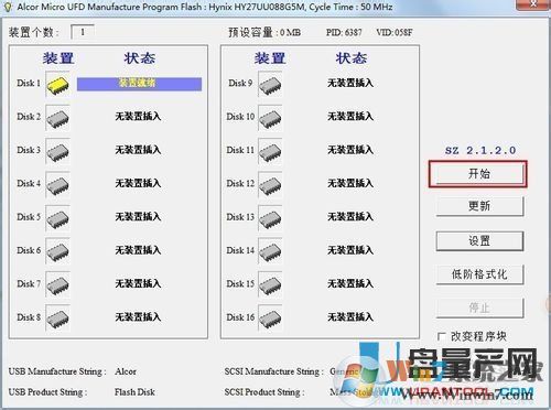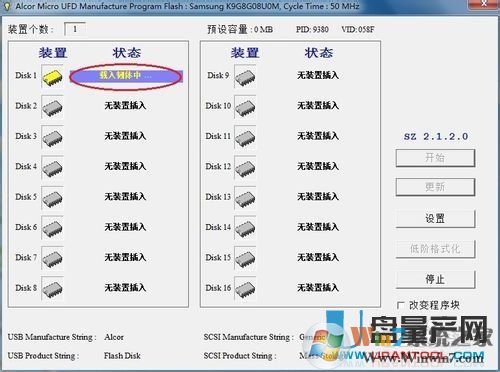 接下来运行与U盘类型相匹配的量产工具,对U盘进行修复操作。(注,U盘类型必须匹配才行,当一个量产工具无法完成U盘的修复操作时,建议多试试其它相关量产工具)