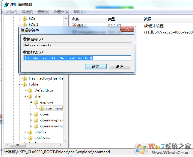 3.确定DelegateExecute数值数据栏中的内容是否为{11dbb47c-a525-400b-9e80-a54615a090c0}。如果不是,请输入 替换内容{11dbb47c-a525-400b-9e80-a54615a090c0} ,再“确定”保存
