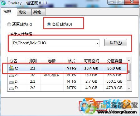 2、打开后选择系统备份,然后选择C盘,并选择好存放GHO备份的文件夹,单击确定;