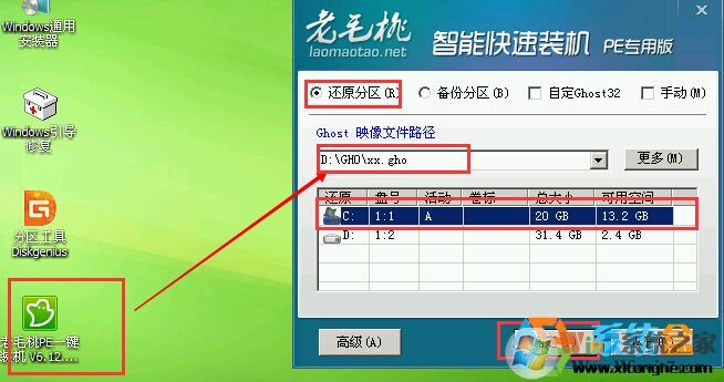 5、分区完成后,我们就可以使用U盘启动盘PE工具里的一键装机工具或Ghost安装器进行系统恢复了,如下图XX.GHO为旧磁盘系统备份。