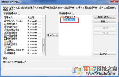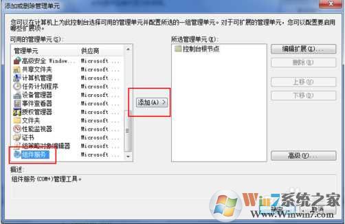 然后在左侧“可用的管理单元”处,将滚动条拉到最下,单击“组件服务”,再点击中间的“添加”按钮。