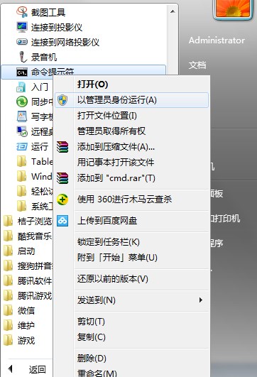 1、在开始菜单,附件中找到命令提示符(cmd),管理员权限运行cmd,