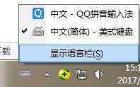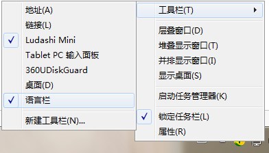 在Win7系统中鼠标右键单击任务栏,把鼠标移动到“工具栏”上,选择“语言栏”,然后按shift+ctrl,打开输入法。如下图: