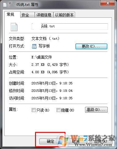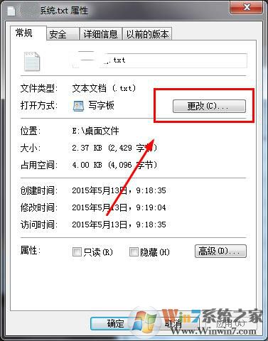 2、在打开的txt属性窗口中,常规选项下找到“更改”按钮,如下图所示: