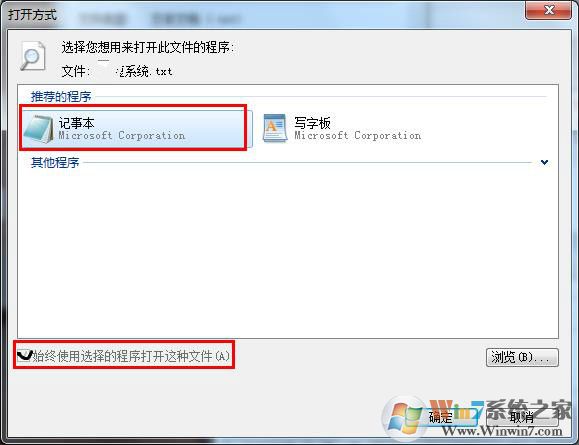 3、然后就打开方式窗口,单击记事本,同时直接勾选“始终使用选择的程序打开这种文件”,再单击“确定”按键;