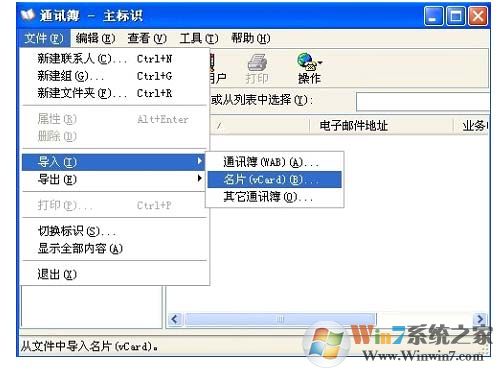2、单击菜单栏的“文件”,弹出的菜单指向“导入”,在下一级菜单单击“名片”