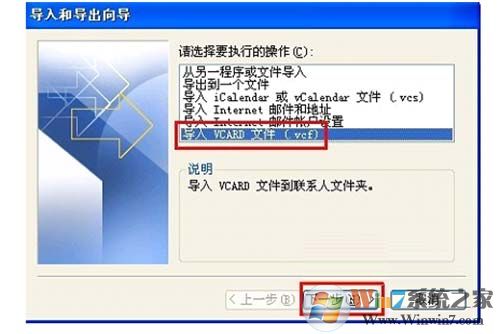 3、打开“导入和导出向导”对话框,在请选择要执行的操作列表框中选中“导入 VCARD 文件(.vcf)”,单击“下一步”按钮