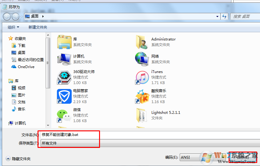 3、另存为,并重命名文本文档,如:修复不能创建对象.bat。并保存到桌面方便查找