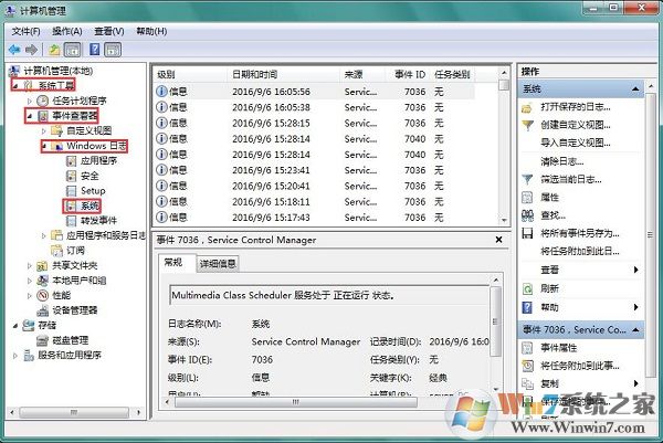 2、进入到另外一个界面后,我们可以看到有一个“事件查看器”,点击进入到里面,接下来又可以看到“Windows日志”,点击进入可以看到“系统”,按这个步骤下去我们找到一个ID为6005和6006的编号,那6005即为开机信息 6006即为关机信息。