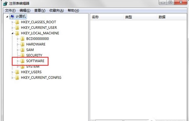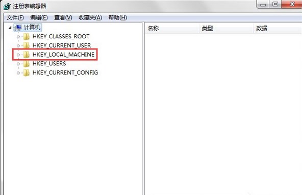 3、进入注册表,找到“HKEY_LOCAL_MACHINE”,请依据下图指示,点击红色框内,箭头所示的文件夹前的三角按钮;