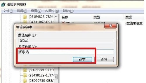 9、点击修改后,出现如下界面,请在数值名称一项中,将“{默认}”修改为“{回收站}”点击确定;