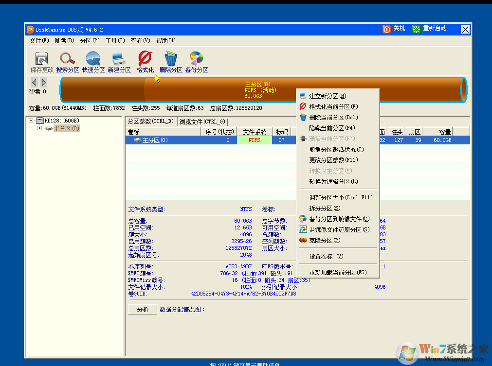 3、首先使用pe系统内的diskgen进行分区,这里小编建议一个分区就好,这里的分区是将之前安装虚拟机时的60g虚拟硬盘进行分区,对win7系统的硬盘没有任何影响,请大家放心分区