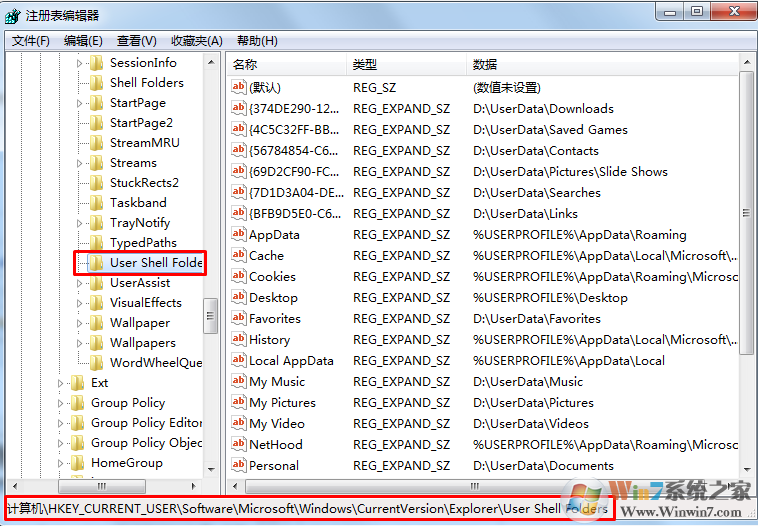 2.打开注册表编辑器,依次展开[HKEY_CURRENT_USER/Software/Microsoft/Windows/CurrentVersion/Explorer/UserShell Folders]项。如下图所示