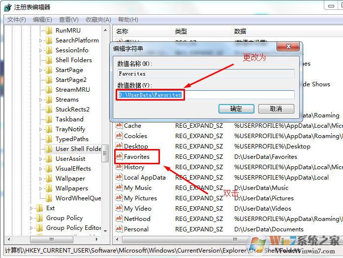 3、在右半侧窗口中找到Favorites,该项就是win7系统收藏夹的目录指定项,双击打开后,将数值更改为:【D:\UserData\Favorites】不含括号