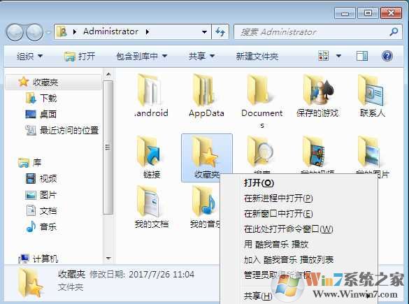 1、打开桌面上的用户文件夹,找到收藏夹,右键属性;