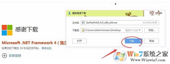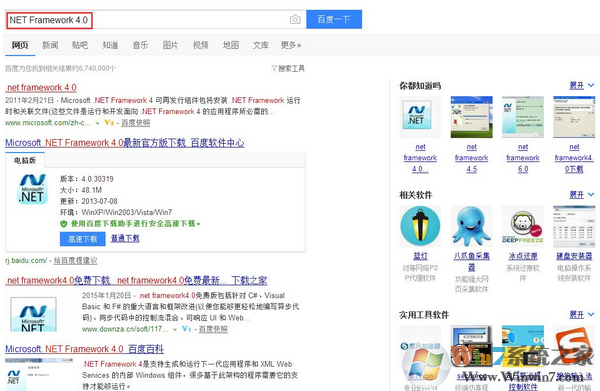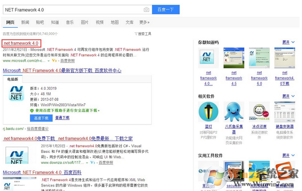 2、如果没有软件就去网上下载,下面讲解一下下载方法,在搜索栏中搜索NET Framework 4.0,如下图: